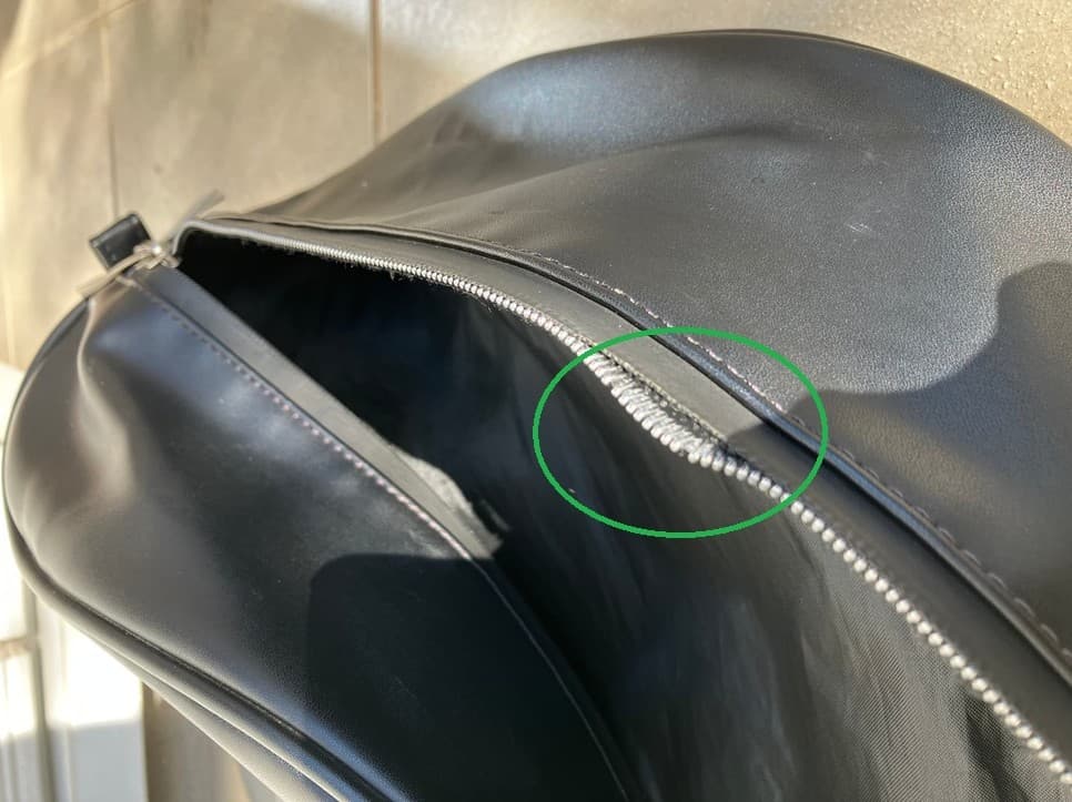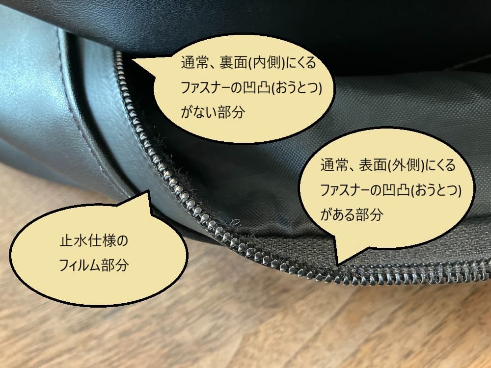 「お客様のバッグは『裏ファスナーの止水仕様』になっています。これは見た目がスタイリッシュで格好いいのですが、スライダーの開け閉めが重くなりやすく、無理に引っ張って壊れるリスクが高い仕様です。また、内側のファスナーの歯の凸凹にクラブが当たって破損の原因にもなります。」